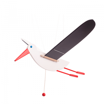Esta hermosa cigüeña cuelga del techo y cuando se tira de la bolita que cuelga y se suelta, se mueve como si realmente estuviera volando en la habitación del bebé.