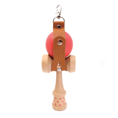 Kendama de madera con enganche de cuero y bola de color amarillo.