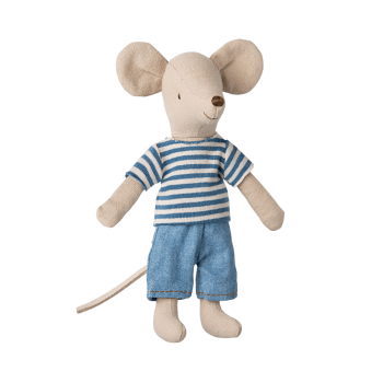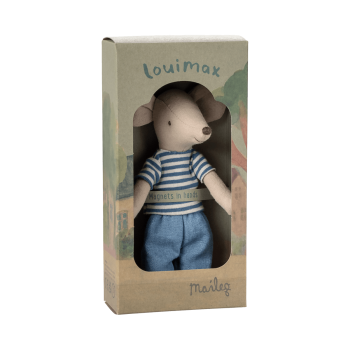 Nuevo ratoncito Maileg con preciosa camiseta a rayas y pantalón vaquero, presentado en bonita caja de regalo. Tiene imanes en las manos.