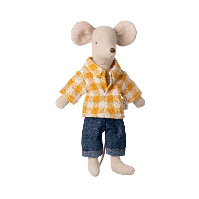 Ahora los papás ratones Maileg los puedes conseguir por separado, aquí tienes al papá con una preciosa camisa de cuadros mostaza.
