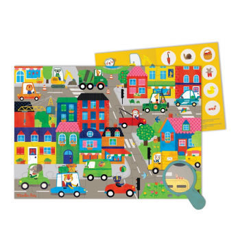 Puzzle de 48 piezas de una ciudad que guarda muchas sorpresas, encuentra lo que guarda oculto este puzzle con la lupa cuando lo hayas hecho. Ideal para peques a partir de 4 años. Colección Popipop de Moulin Roty.