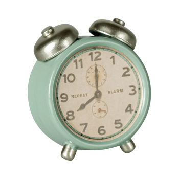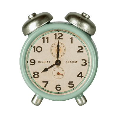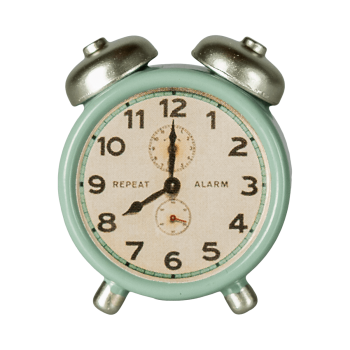 Los Ratones de Maileg ya tienen un despertador con el que podrán levantarse cada mañana para ir a trabajar. Este es de un color verde menta.