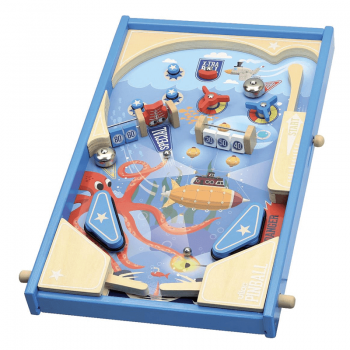 Esta máquina de pinball de madera de Vilac contiene 3 bolas de metal para derribar objetivos, activar campanas, sacar torniquetes… Obtén la mayor cantidad de puntos y gana la batalla bajo el mar.